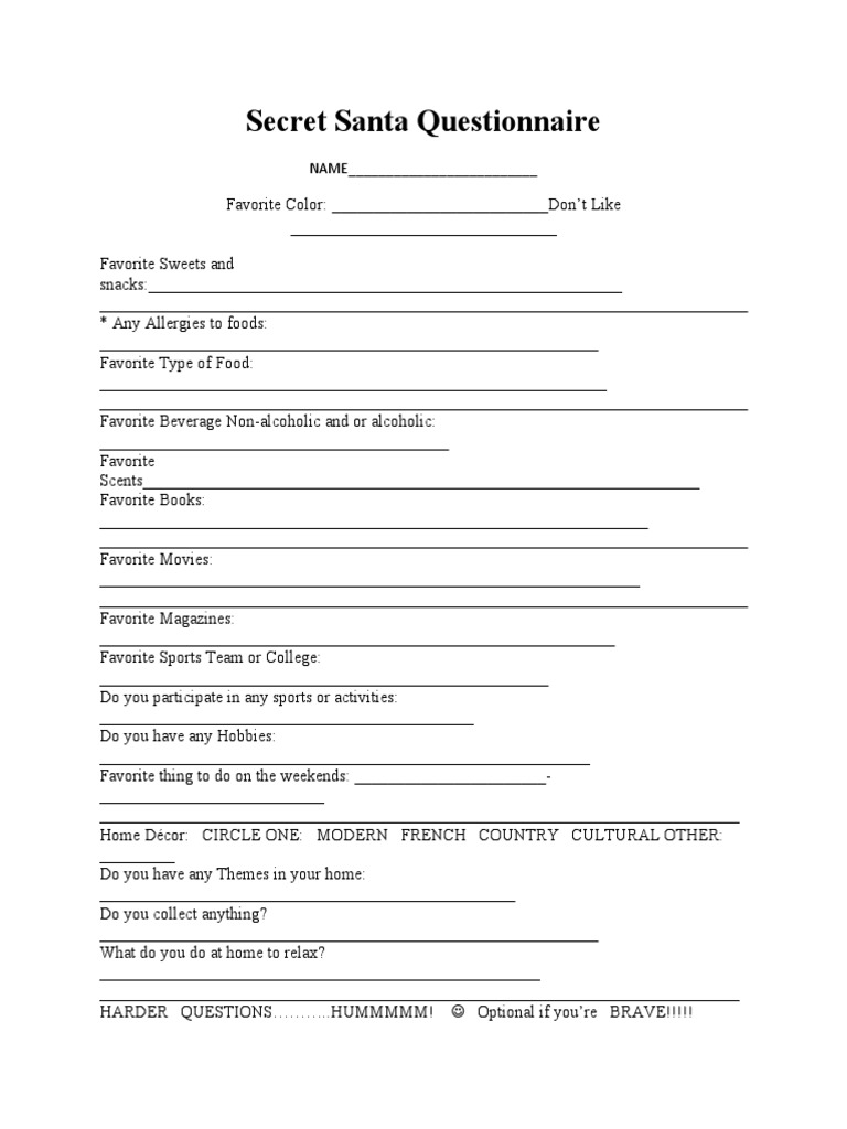 See full list on gifts.com See full list on gifts.com See full list on gifts.com What are good questions to ask secret santa? It often becomes a dilemma to choose the perfect gift when you pick a person's name and you don't know what to get them. From foodies to fashionistas, these themed prompts will show your secret santa partner that you Printable questions and answer sets are rather basic to use. Get all the details with this "deep dish" printable for your gift recipients. Create your own secret santa questionnaires. See full list on gifts.com 25 printable secret santa questionnaire templates. Dec 10, 2018 · secret santa questions and printable. If you don't find what you need with the other 4 secret santa questions, then you can be creative with some of your own!